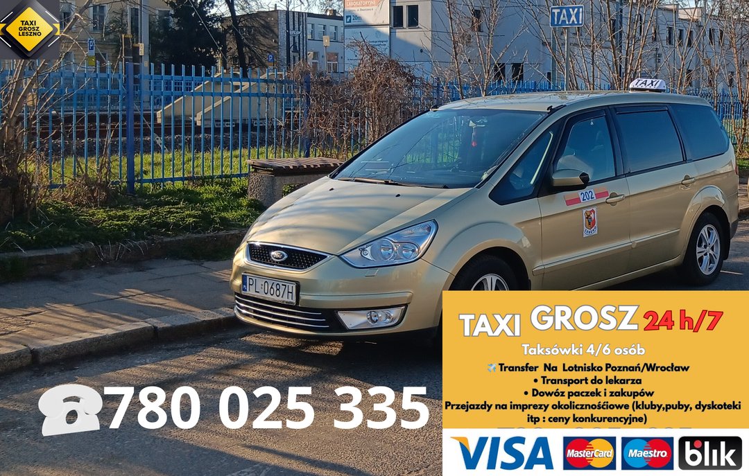 Taxi Grosz Leszno 24/7 • Profesjonalna firma taksówkarska Leszno 🚕 TAKSÓWKI W LESZNIE I OKOLICACH – ZAWSZE DOSTĘPNE 24/7 ✅ Punktualność - nigdy się nie spóźniamy ✅ Bezpieczeństwo Pasażerów - doświadczeni kierowcy Taxi Leszno , regularne przeglądy taksówek w Lesznie ✅ Komfort - czyste, zadbane pojazdy ✅ Niskie ceny - konkurencyjne stawki na rynku ✈️ TRANSFER NA LOTNISKO POZNAŃ & WROCŁAW 24/7 • Bezpieczny i punktualny dojazd TAXI • Pojazdy dla 4-6 osób • Bez ukrytych kosztów 💸 📍 POSTÓJ TAKSÓWEK W LESZNIE • Lokalizacja: ul. Towarowa 64 • Zawsze dostępni 24/7 • Szybki przyjazd (średnio 5 minut) • Profesjonalna obsługa • Komfort i dobra cena SZEROKI ZAKRES USŁUG 📞 ZADZWOŃ: +48 780 025 335 💳 PŁATNOŚCI: Karty+ Gotówka 🕒 DOSTĘPNOŚĆ: 24/7/365